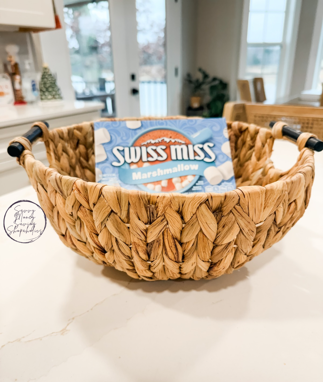 I bought this basket to make a gift basket with (but I obviously can’t show the contents because I know they’ll see it 😆). So the Swiss Miss is just for you to see the size. It’s deep and I love that it had handles. I wanted something that they could use for other things and this one looked perfect! You could use it as a planter (IMO), for storage, a fruit bowl, yarn bowl, etc!