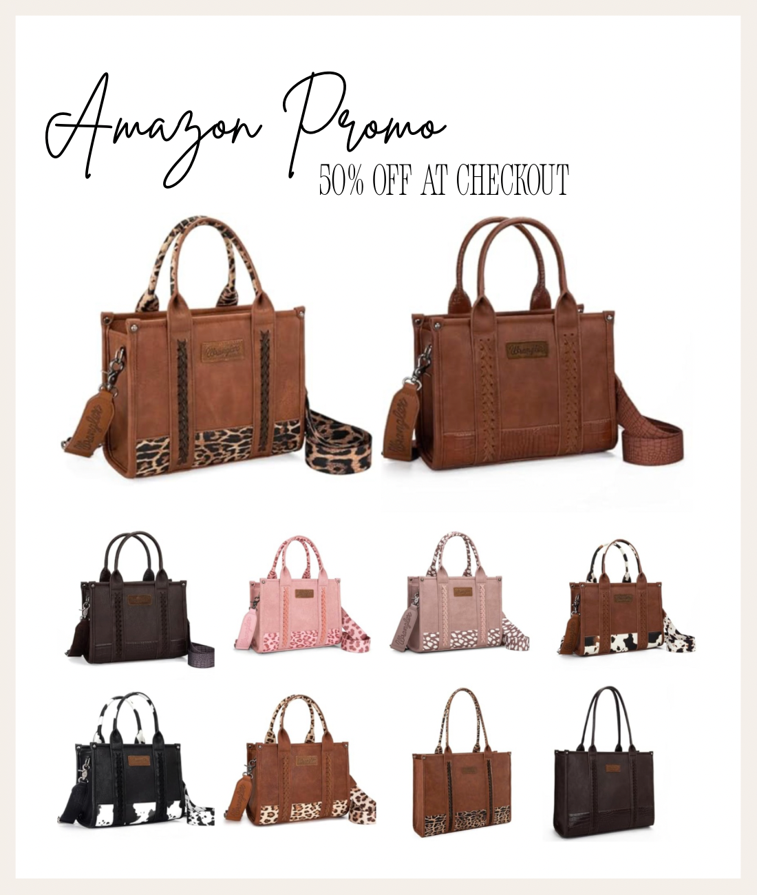 50% off Wrangler Cow Print Tote Bags at checkout! There’s 2 sizes in these!