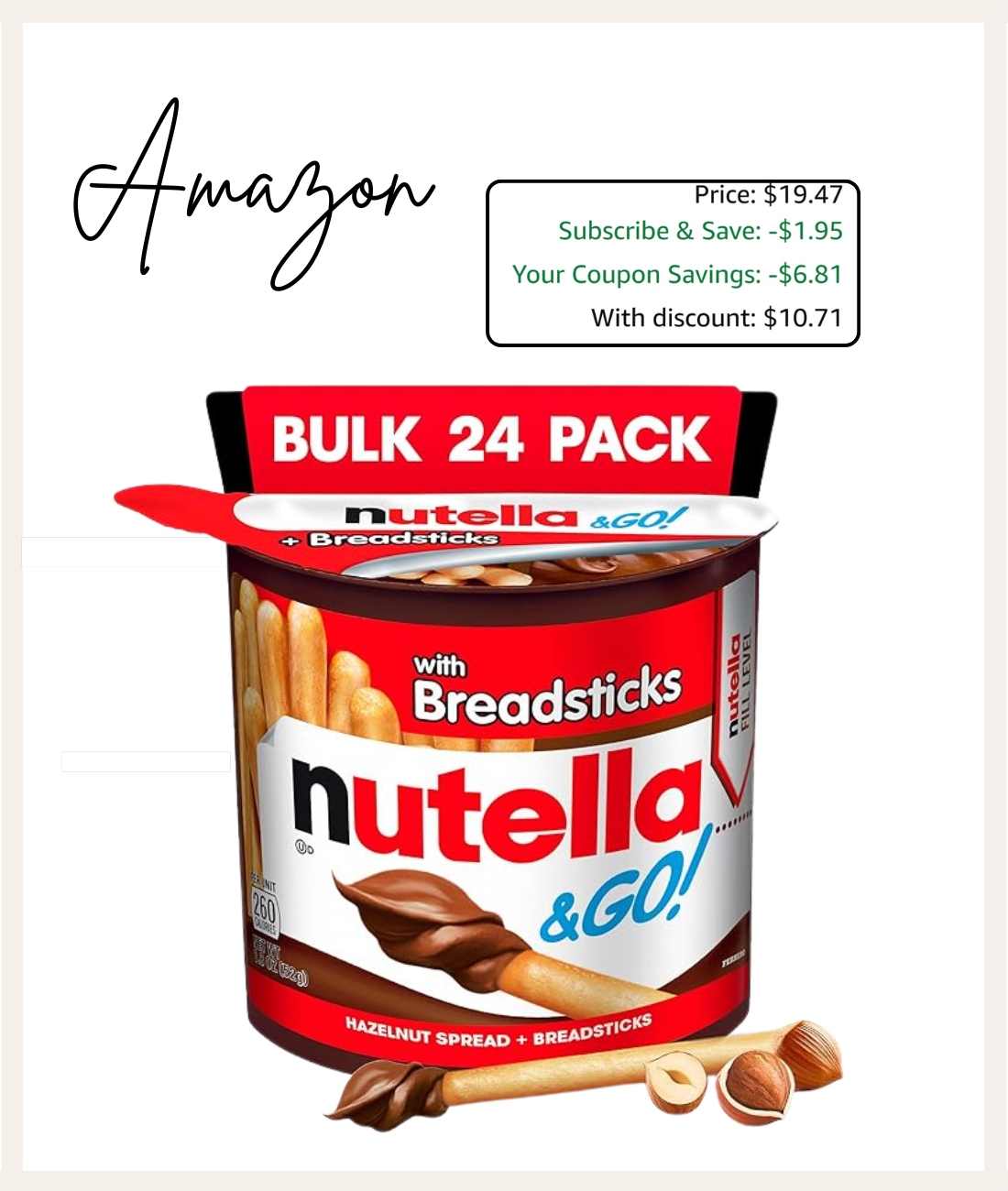Score!! Nutella normally $2.48 EACH, but you can get the 24 count as low as $11-making them just $.45 each!